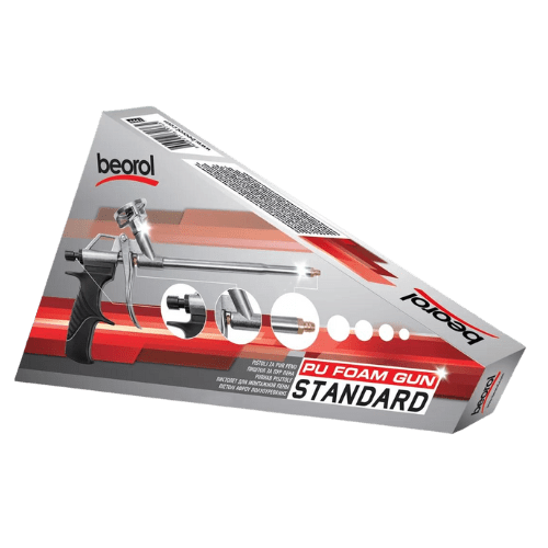The Beorol PU Foam Gun is a precision applicator designed to dispense polyurethane foam cleanly and with control. It is constructed of durable materials and its parts coated with PTFE (Teflon) to reduce foam buildup and ease cleaning. The gun typically comes with extra nozzles or tubes to facilitate work in different angles or hard‑to‑reach spots. Its trigger mechanism allows for fine adjustment of foam flow, helping minimize waste or overapplication. To maintain optimal performance, it must be cleaned after each use—especially before foam cures inside the barrel—to avoid clogs or deterioration.