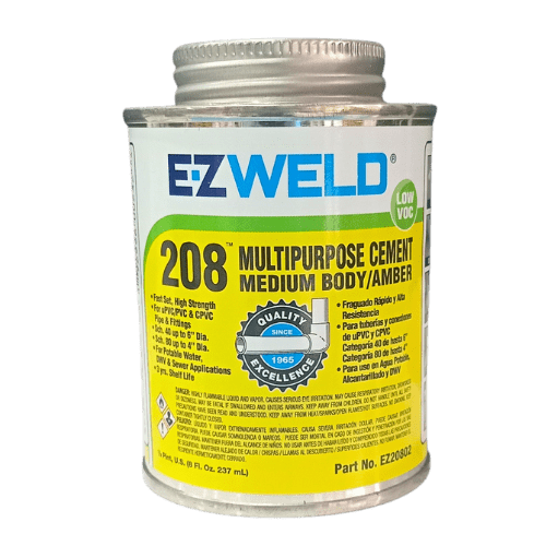 EZWeld Multipurpose Cement 208 is a multifaceted, high-strength adhesive designed for bonding PVC, CPVC, ABS, and other plastic pipes and fittings. This solvent-based cement creates durable, leak-proof bonds that are resistant to water, pressure, and chemicals, ensuring reliable performance in a wide range of plumbing applications. Its fast-drying formula allows for quick, efficient installations, reducing downtime during projects. The 8-oz size is ideal for medium to large-sized jobs, providing the right amount of cement for those substantial projects. EZWeld Multipurpose Cement is a trusted choice for both professionals and DIY enthusiasts, ensuring secure, long-lasting connections for plastic piping systems.